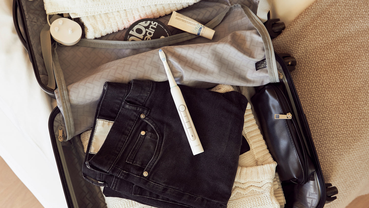 Entdecke dein strahlendes Lächeln für unterwegs und lasse unsere Schallzahnbürste dein treuer Reisebegleiter sein.